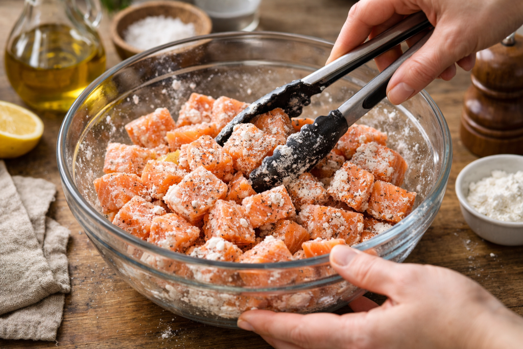 Cut the salmon into 1-inch cubes and pat them dry with paper towels. Dry salmon helps the coating stick better and crisp up nicely.