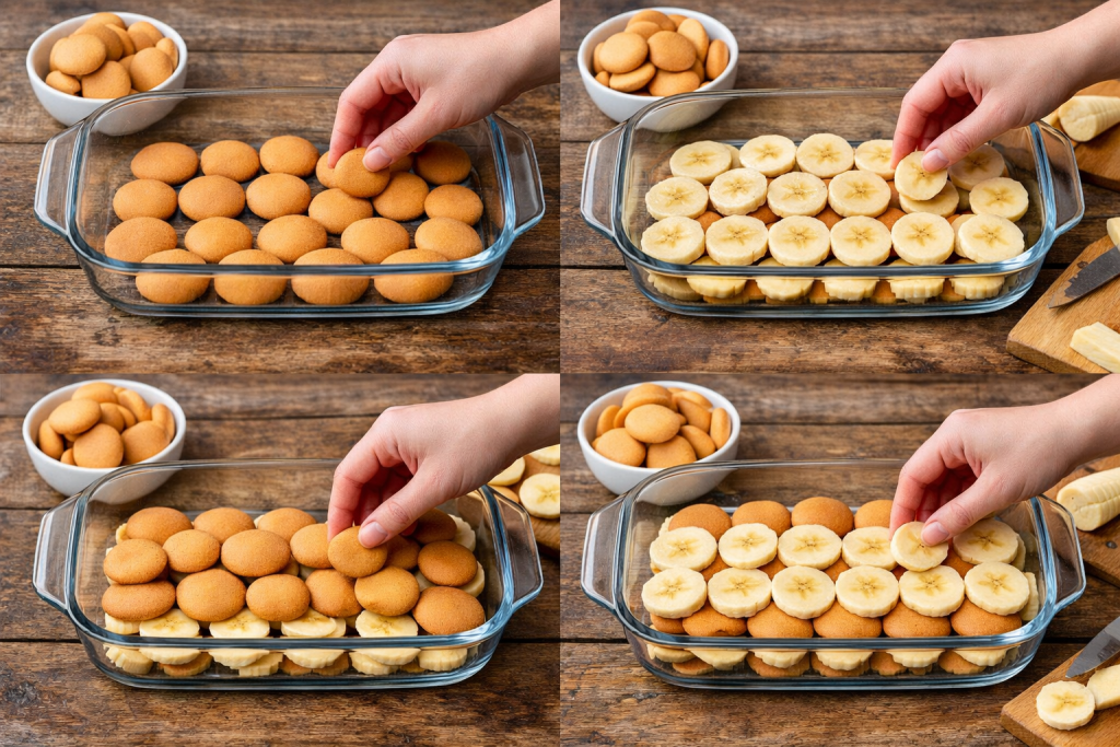 Add cream β cookies β bananas. Repeat 2β3 times.