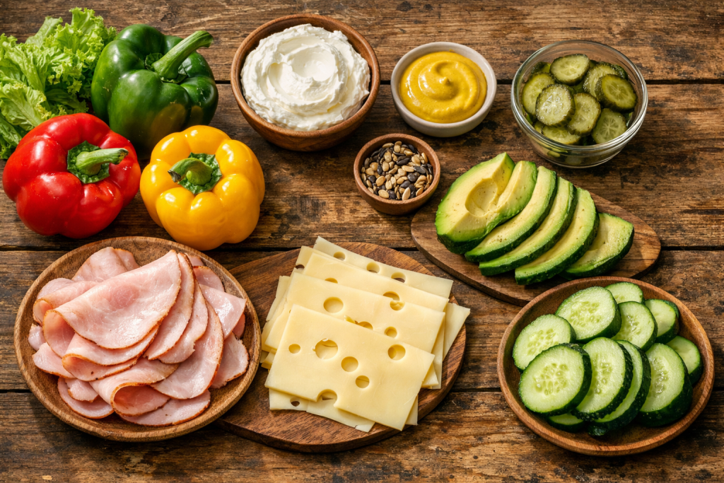 Ham, turkey, chicken, cheese, avocado, and hummus work well.