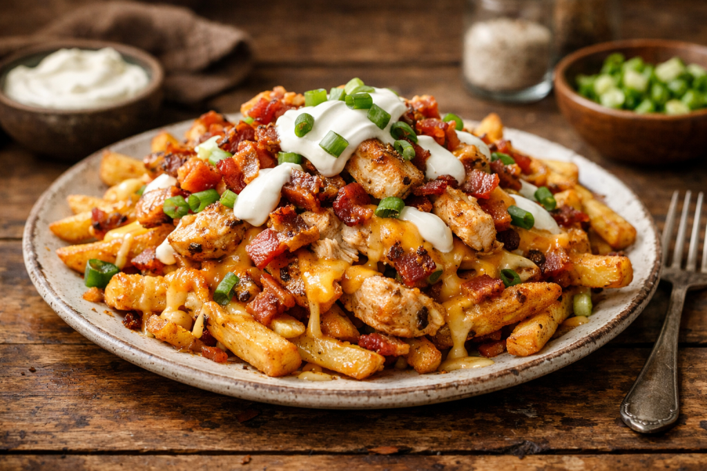 Loaded fries with chicken, bacon, and cheese are rich and satisfying.