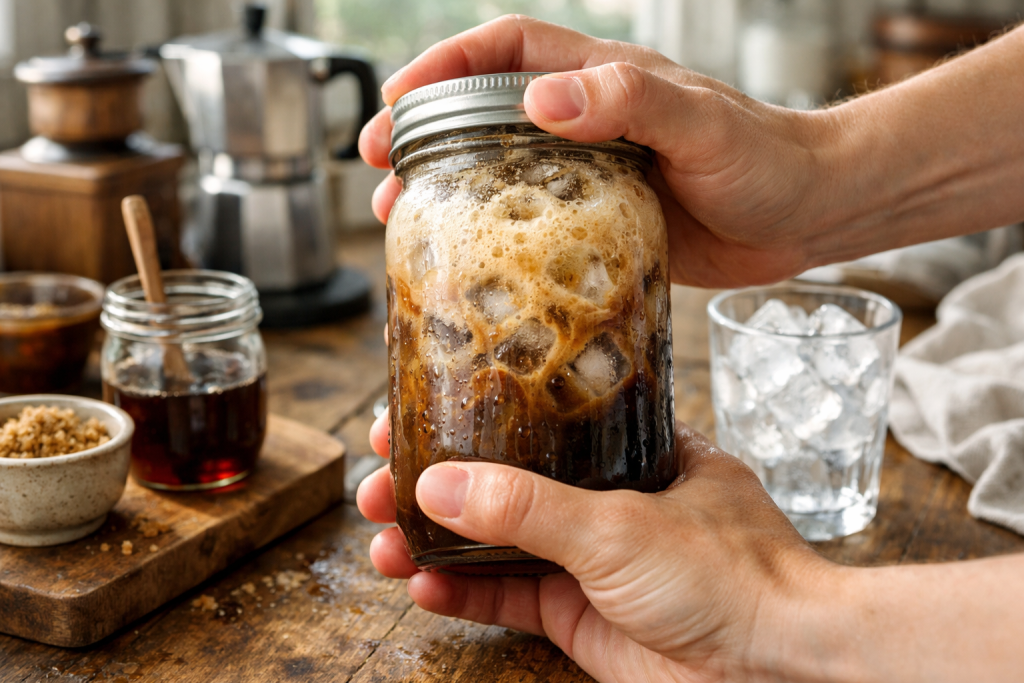 Shake vigorously for about 15–20 seconds until the coffee becomes frothy and well chilled.