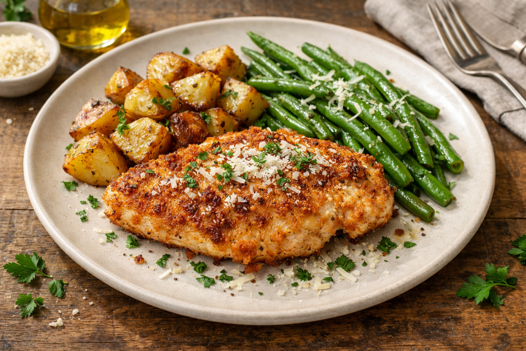 The Parmesan crust gives the chicken a golden, crunchy texture.