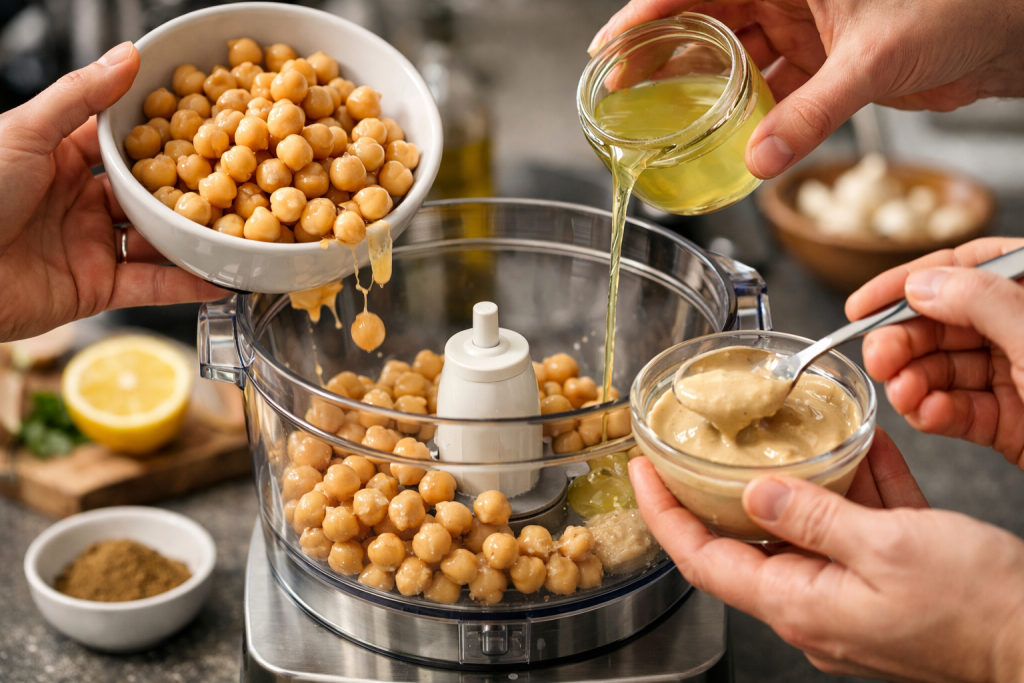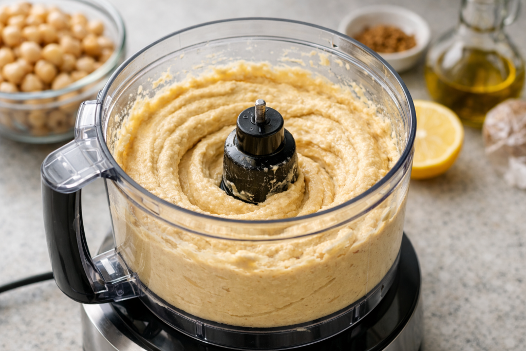 If the hummus seems too thick, add 1–2 tablespoons of water and blend again until silky smooth.