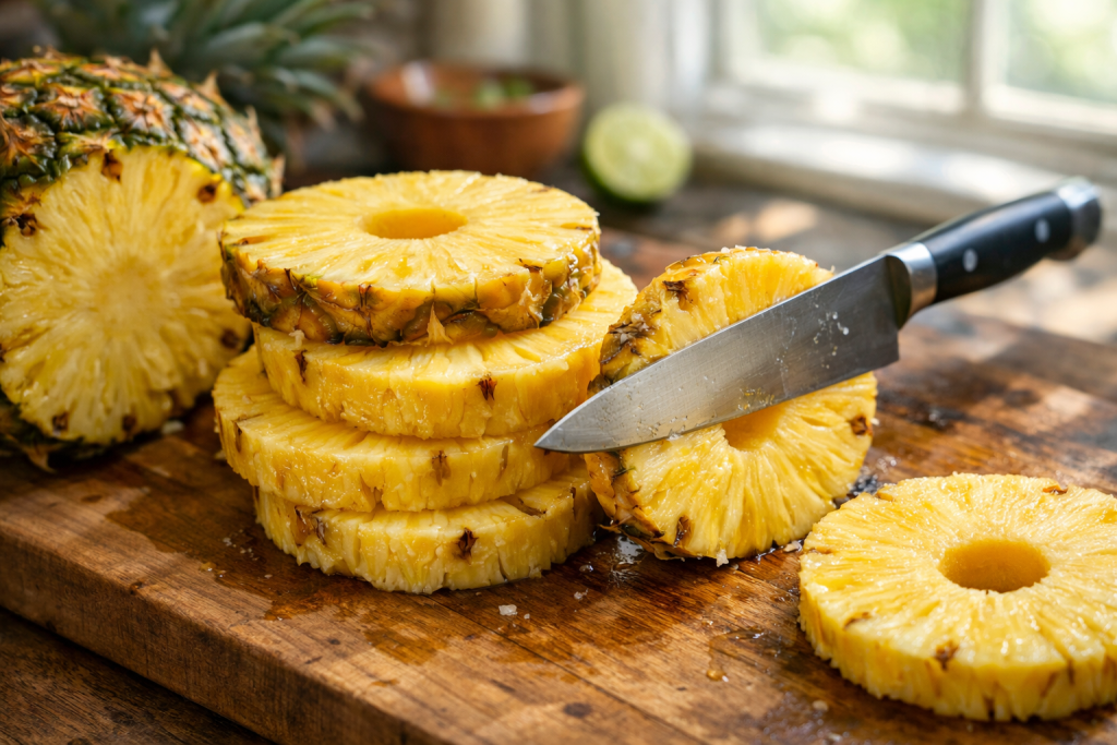 Start by peeling the pineapple and slicing it into rings about ½ inch thick. Remove the tough core in the center and set the rings aside.