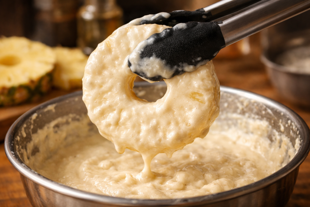 Dip each pineapple ring into the batter, making sure it is fully coated.