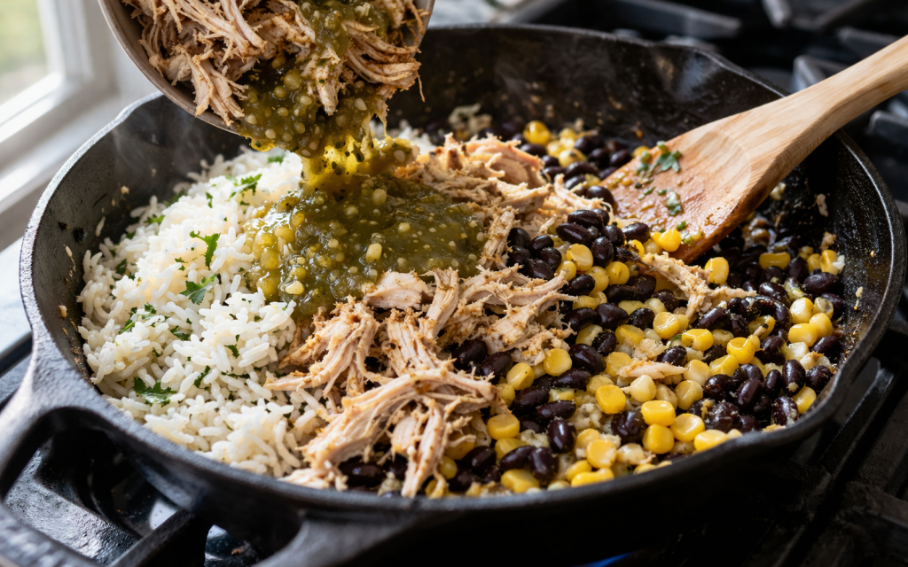 Add chicken, rice, beans, corn, salsa verde, and broth. Mix well.