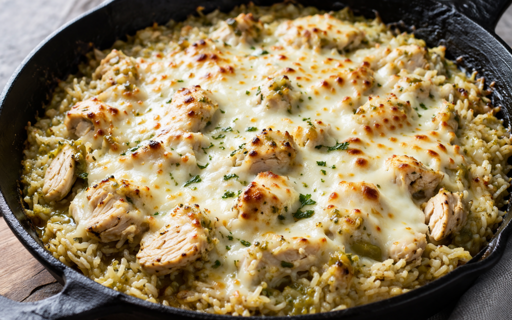 This salsa verde chicken and rice recipe is a quick and flavorful one-pan meal that’s perfect for busy days. It combines tender chicken, fluffy rice, and tangy salsa verde with melted cheese for a rich and satisfying dish.