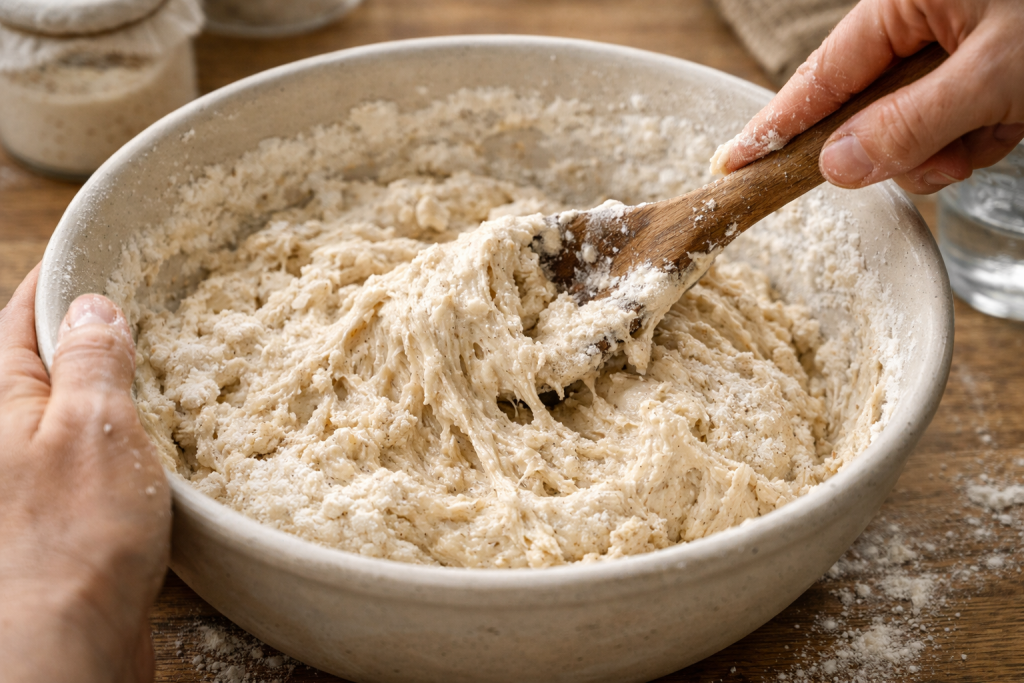 In a large bowl, mix your sourdough starter with warm water. Stir until fully combined. Add flour and salt, then mix until a sticky dough forms.