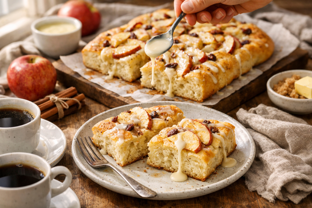 This recipe is a creative twist on traditional focaccia bread. Instead of savory herbs and olive oil, this version is loaded with caramelized cinnamon apples, rich butter, and a sweet vanilla glaze. It tastes like a mix between a soft donut and homemade bread—perfect for breakfast, brunch, or dessert.