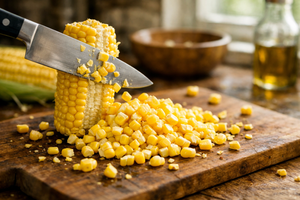 Remove the husks and silk from the corn. Slice the kernels off the cob using a sharp knife. Fresh corn gives the dish natural sweetness and bursts of flavor.