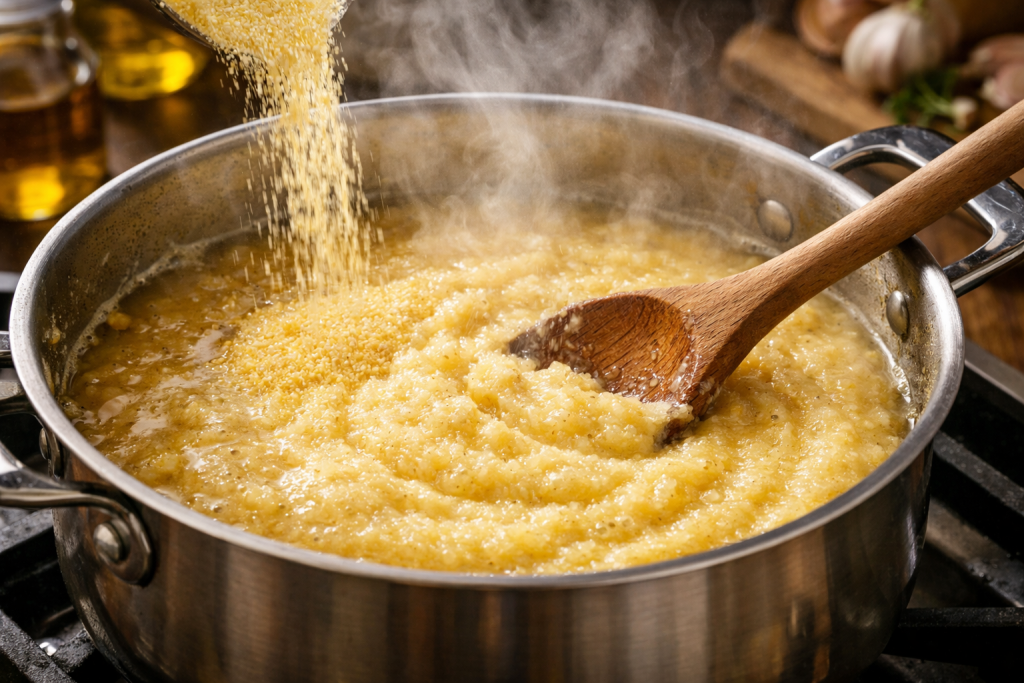 In a large saucepan, bring vegetable broth or water to a gentle boil and add salt. Slowly whisk in the polenta while stirring constantly to avoid lumps.