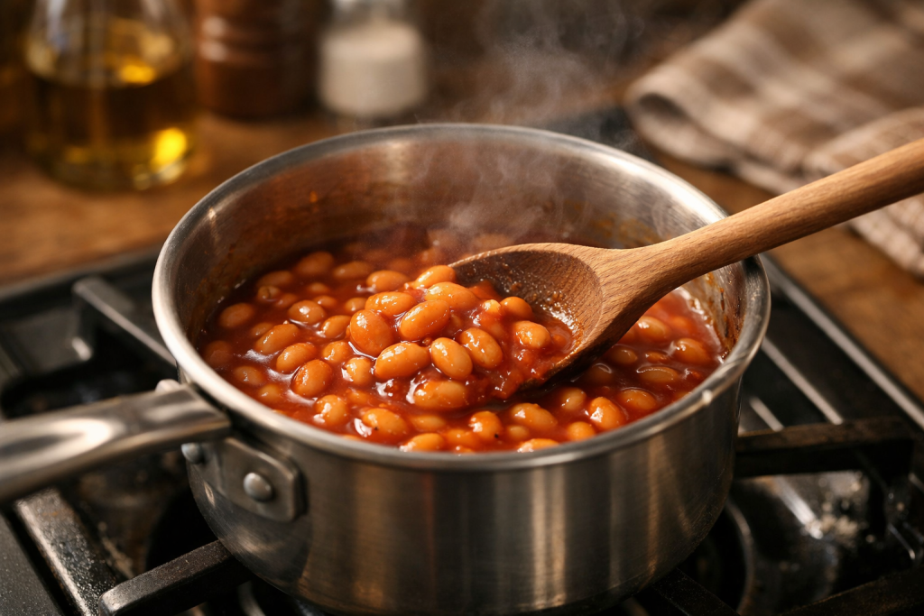 In a small saucepan, heat the baked beans over medium-low heat. Stir occasionally so they warm evenly.