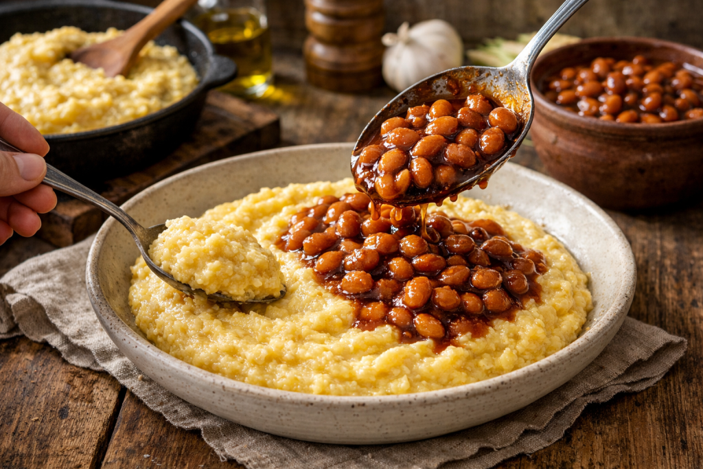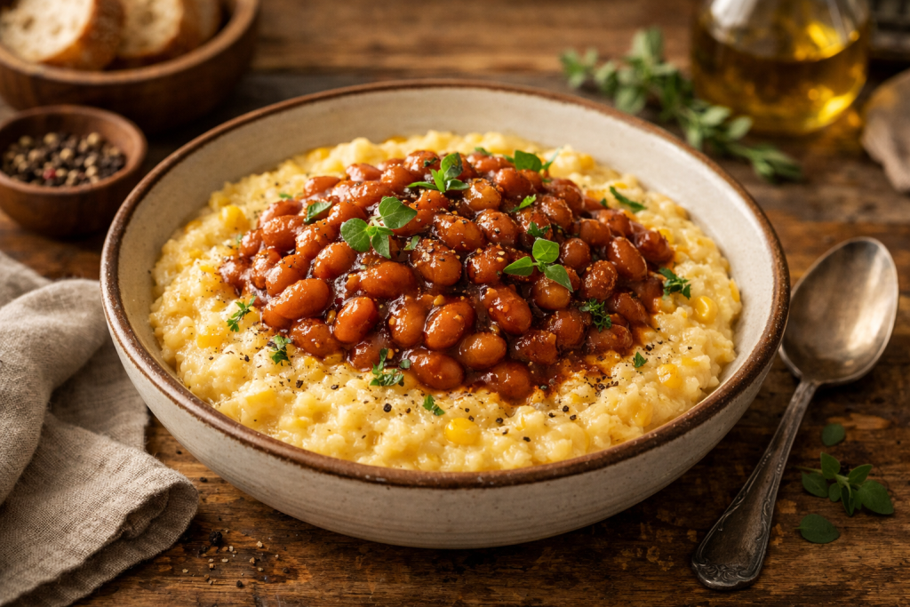 The combination of creamy corn polenta and savory baked beans creates a balanced meal that’s both hearty and wholesome.